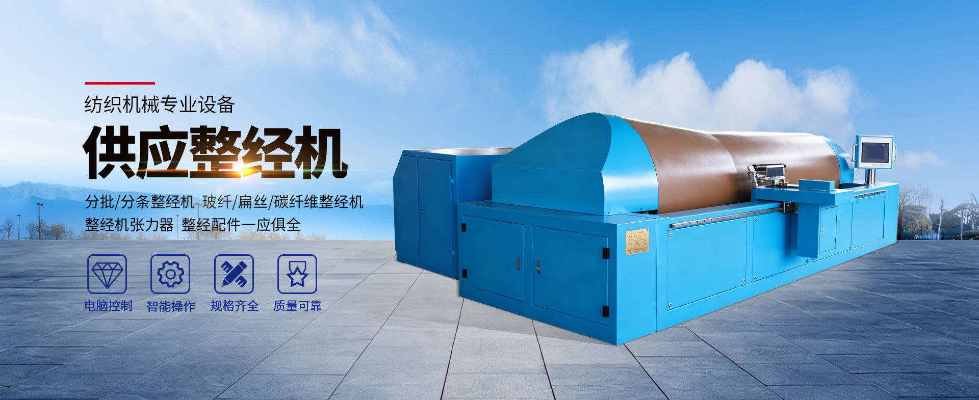 公司主营产品有:分批、分条整经机;玻纤、扁丝、碳纤维整经机。玻纤、扁丝、碳纤维退绕纱架;预浸带退绕纱架、预浸布配套纱架及其他特殊复合材料纱架。翻转纱架V型纱架、铁二立柱张力器.玻璃纤维专用转动二立柱张力器、铁三立柱张力器,织带机张力器、玻璃纤维网格布张力器、液压补偿阻尼张力器、经编专用油压张力器、长丝塑料六环张力器、棉纱三环张力器、重锤张力器,吊环张力器,织带、拉链张力器、红外线断纱自停装置、气液增压缸、液压制动器、刹车钳、电磁离合器等。